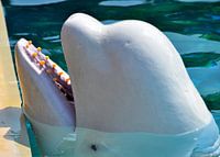 Deze witte dolfijn (Beloega; beluga whale; Delphinapterus leucas) is op 12 juli 2012 gefotografeerd in Marineland®, Ontario, Canada.