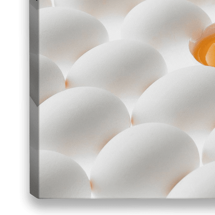 Witte eieren, liggend op hun zij, waarvan er eentje open is.