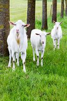 Witte geiten in gras met boomstammen in natuur. Drie geiten op een rij met bomen en gras op de achtergrond. Alle drie de dieren kijken nieuwsgierig naar de camera.