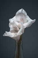 Deze prachtige gladiolen staan te pronken in een klein flesje. Met behulp van een flitser is de belichting tot stand gekomen. De donkere grijs-blauwe achtergrond vormt een mooi contrast met de bloemen de kleurstelling past bijvoorbeeld mooi in een sfeervol industrieel interieur.