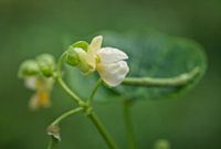 Witte groene bonenbloemen met boon - een cluster witte bonenbloemen bedekt met ochtenddauw met een groot blad en een boon die erop rust. De achtergrond is medium warm groen. Het uitzicht is op ooghoogte en de sfeer is die van een vroege herfstochtend.