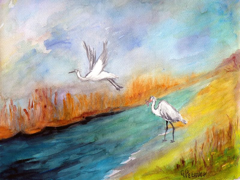 White Heros, witte reigers aan een beekje, rustige sfeer, heldere kleuren , creatieve schilderachtige vertaling van een inspiratie in de vrije natuur, kunst voor natuurliefhebbers