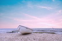 Een witte houten boot ligt in het zand op het strand van de Oostzee, kort na zonsondergang. Het licht is zacht in delicate pasteltinten.