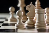 Witte houten schaakstukken met focus op de ridder op een schaakbord tegen een zwarte achtergrond, kopieerruimte, close-up met geselecteerde focus en smalle scherptediepte
