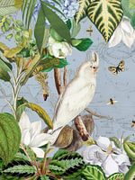 Dompel je kamer onder in tijdloze elegantie met een vintage jungle muurschildering van Uta. Twee sierlijke witte kaketoes zitten te midden van torenhoge palmbomen, omringd door weelderig groen gebladerte en delicate witte exotische bloemen. De lichtblauwe, op landkaarten geïnspireerde achtergrond voegt een vleugje reislust en verfijning toe en roept de charme op van historische ontdekkingsreizen. Dit luxueuze ontwerp combineert de ingewikkelde details van vintage schilderijen met een moderne collage-esthetiek, waardoor een sereen maar opvallend middelpunt ontstaat. Perfect voor verfijnde interieurs, het vangt de schoonheid van de natuur met een vleugje verfijning en avontuur.