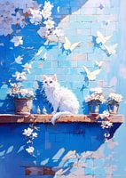 In een serene blauwe sfeer rust een witte kat gracieus uit, zijn vacht glinstert zachtjes. Vlakbij fladdert een delicate witte vlinder speels, af en toe landend op een maagdelijk witte bloem die vlakbij bloeit. Het harmonieuze tafereel roept een gevoel van rust en elegantie op en toont de schoonheid van de natuur in zachte, rustgevende tinten.