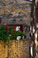 Witte kat likt poot op oude stenen muur in charmant Frans dorp