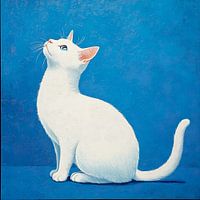 Deze levendige afbeelding toont een witte kat met stralend blauwe ogen, nieuwsgierig omhoog kijkend alsof hij op het punt staat een grote sprong te wagen. Het speelse katje is prachtig uitgelicht tegen een felblauwe achtergrond, waardoor zijn sprankelende persoonlijkheid echt naar voren komt. Dit kunstwerk brengt een frisse, vrolijke sfeer in elke kamer en is perfect voor kattenliefhebbers die wat dynamiek en energie aan hun interieur willen toevoegen. Een echte blikvanger die de avontuurlijke kant van elke ruimte naar voren haalt!