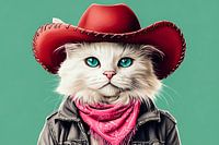 Dit unieke kunstwerk toont een elegante witte kat in een rode cowboyhoed, gecombineerd met een speelse roze bandana en een groene achtergrond. De prachtige blauwe ogen van de kat trekken direct de aandacht, terwijl de gedetailleerde afwerking en kleuren het geheel tot leven brengen. Perfect voor een eigentijds interieur of als een…