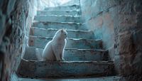 Witte kat op een trap panorama schilderij die een prachtige toevoeging zal zijn aan elke ruimte. Met zijn unieke en stijlvolle uitstraling is het een ware eyecatcher. De schitterende kleuren en het bijzondere ontwerp maken dit kunstwerk 100% uniek en origineel. Het is de perfecte fotoprint om je interieur helemaal af te maken.