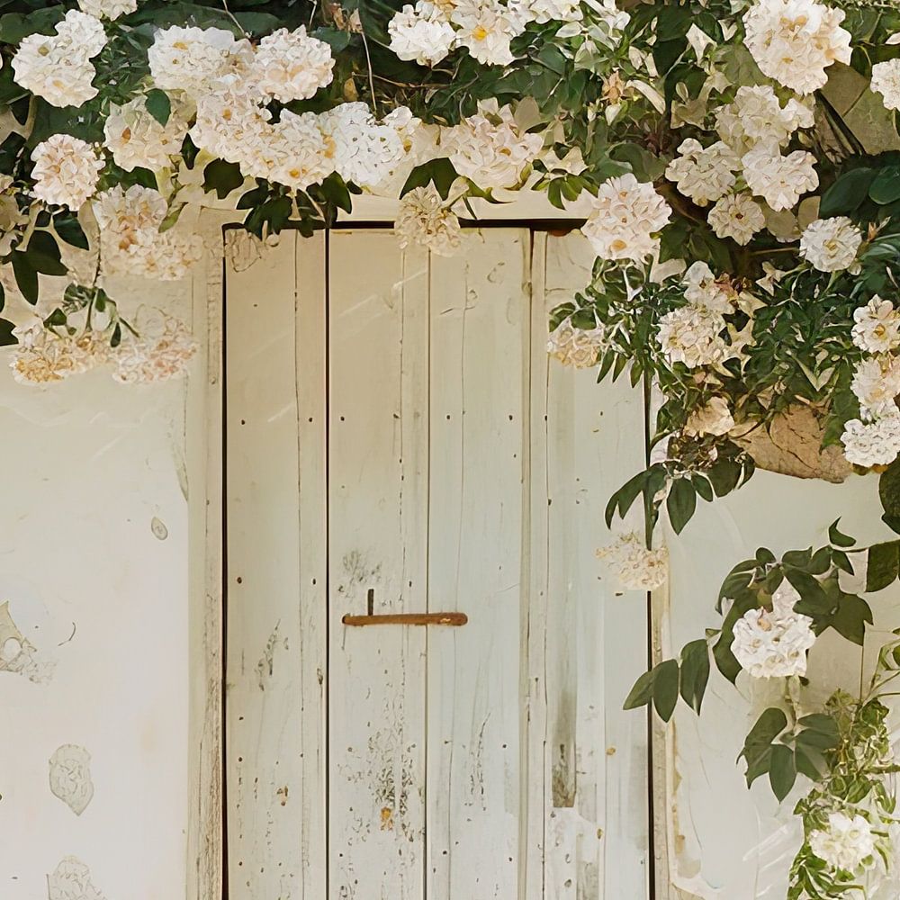 Deze afbeelding toont een rustieke, verweerde houten deur in een oude witte muur, volledig omgeven door een uitbundige bloei van lichtroze tot bijna witte rozen. De bloemen slingeren zich natuurlijk en wild over de muur en deur, wat een gevoel van vrijheid, natuur en tijdloosheid oproept. Het zonlicht werpt zachte schaduwen op de muur, wat zorgt voor een warme, zomerse gloed en een bijna dromerige sfeer.