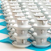 Witte koffiekopjes met bordstandaard op een rijtje gestapeld van Hans-Jürgen Janda