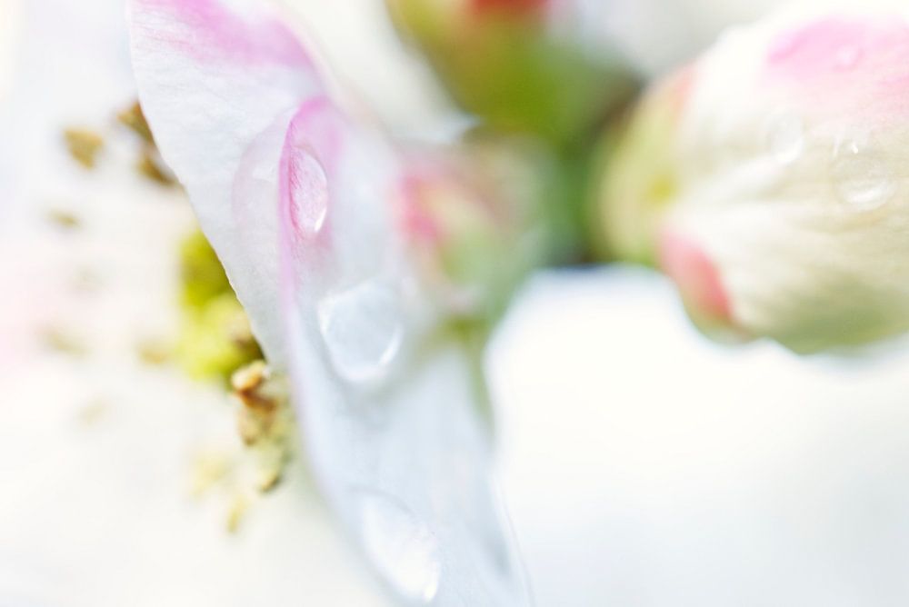 De selectieve focus die ik voor dit florale macro-kunstwerk heb gekozen, richt zich alleen op de randen van de twee kweepeerbloesems op de voorgrond. Ik vond het prachtig hoe de regendruppels op de bloemblaadjes zaten en wilde het oog van de kijker naar dat aandachtspunt brengen. Het uitzicht is iets onder ooghoogte, zodat het lijkt alsof je naar de kweeperenstruik stapt en naar de lucht kijkt.