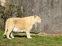 Leeuwen hebben meestal een hazelaar of goudbruine kleur voor hun vacht. In het geval van witte leeuwen is de vacht echter volledig wit of een zeer bleke versie van de gebruikelijke hazelaar bont. De kleur van de vacht kan variëren van blond tot bijna wit. Deze verkleuring wordt geërfd van de ouders, maar is een recessieve eigenschap, wat betekent dat de kans groter is dat een hazelaar kleurrijke leeuw uit hazelnootkleurige leeuwen wordt geboren dan die van een witte leeuw. Evenzo kan fokken in witte leeuwen resulteren in bruine nekken. bron wikipedia.