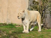 Leeuwen hebben meestal een hazelaar of goudbruine kleur voor hun vacht. In het geval van witte leeuwen is de vacht echter volledig wit of een zeer bleke versie van de gebruikelijke hazelaar bont. De kleur van de vacht kan variëren van blond tot bijna wit. Deze verkleuring wordt geërfd van de ouders, maar is een recessieve eigenschap, wat betekent dat de kans groter is dat een hazelaar kleurrijke leeuw uit hazelnootkleurige leeuwen wordt geboren dan die van een witte leeuw. Evenzo kan fokken in witte leeuwen resulteren in bruine nekken. bron wikipedia.