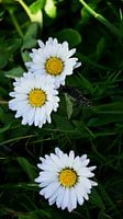 Een lichte en vrolijke foto van witte madeliefjes in het groen. De eenvoudige schoonheid van deze bloemen brengt een frisse, natuurlijke en tijdloze lentesfeer in huis.
