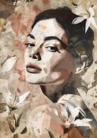 Portret van een vrouw versmolten met een witte magnolia. Divers stijlgebruik door elkaar. Mixed media in meerdere lagen opgebouwd. Kleurstelling is bruin, beige, terra, grijs, zwart en wit. Aardetinten. Passend bij diverse stijlen en trends.