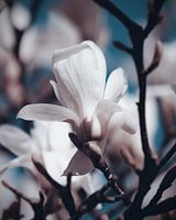 Een foto van een bloeiende witte magnolia, digitaal bewerkt in een zachte tint (roze-turquoise-sepia).