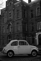 Koop de foto Witte oldtimer voor de Universiteit van Amsterdam, zwartwit foto van Phillipson Photography op canvas, aluminium dibond, (ingelijste) fotoprint, behang en ArtFrame, op maat geprint in Fine-Art kwaliteit.