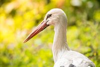Witte ooievaar (Ciconia ciconia) vogel met kenmerkende witte en zwarte veren op zoek naar voedsel in een weiland in de zomer. Close up portretkopschot.
