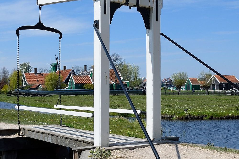 Gezien de hoeveelheid kleine waterwegen in de Zaanse Schans in Nederland, zijn er bruggen nodig om ze over te steken. Sommige daarvan zijn ophaalbruggen zoals deze kleine witte.
