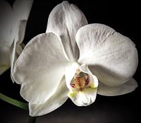 Close-up van een witte orchidee op een zwarte achtergrond.