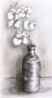 Stilleven van een vaasje met een tak van witte orchideetjes. Zwart potlood op wit papier.