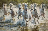 Een groep witte paarden rent over het water, in de stijl van een olieverfschilderij, met penseelstreken, heldere details, prachtige kleuren, natuurlijk licht en een gevoel van vrijheid.