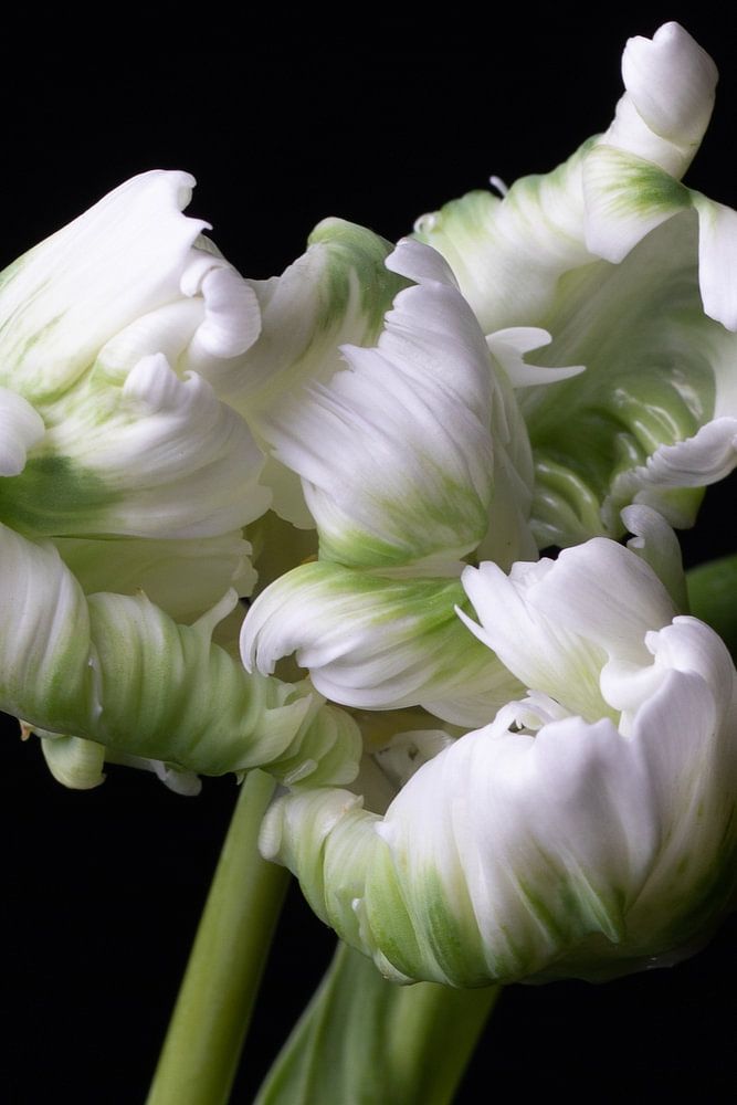 Bijzondere witte papegaai-tulp. Papegaai-tulpen - of parkiettulpen, zoals ze vroeger meestal genoemd werden - hebben zeer aparte bloemen met gedraaide en gefranjerde bloemblaadjes als gevolg van mutaties uit andere variëteiten.