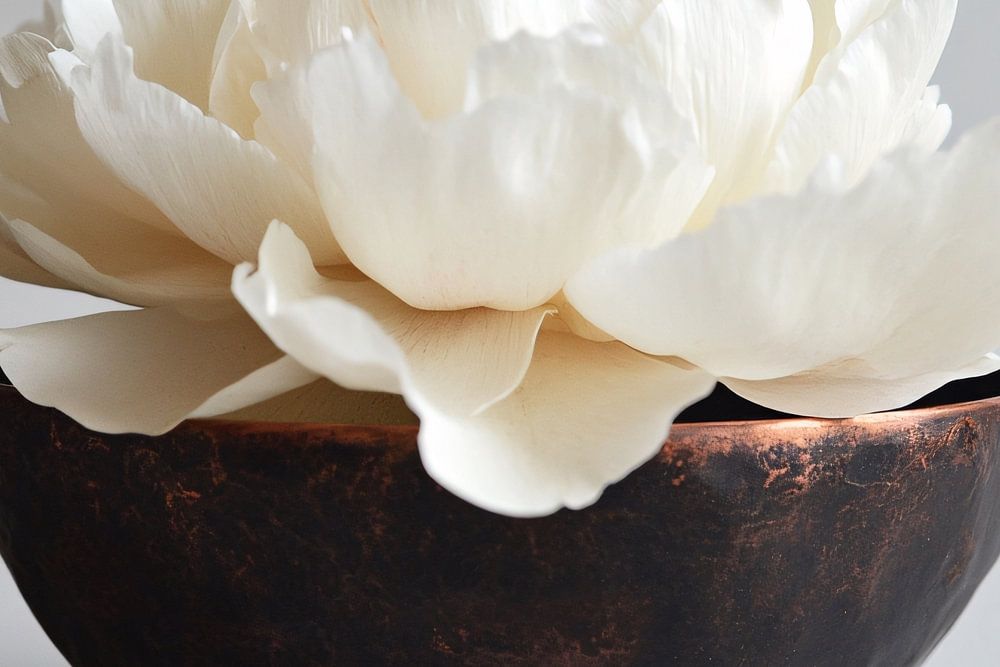 Een prachtig ontwerp met een delicate witte pioenroos, zacht rustend in een koperen kom. De combinatie van het strakke, minimalistische ontwerp en de natuurlijke schoonheid van de bloem straalt een serene sfeer uit. De neutrale kleuren en het Japandi-stijlelement maken dit een ideaal stuk voor moderne en rustgevende interieurs, zoals slaapkamers of eetkamers. Het ontwerp benadrukt de eenvoud en elegantie van de natuur, perfect voor liefhebbers van botanische kunst en minimalistische esthetiek. Een ideale keuze voor een ruimte die zowel rust als stijl uitstraalt.