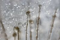 "Witte pluisjes met druppeltjes water" is een macrofoto van waterdruppels op de pluisjes van een paardenbloem. Deze bewerkte foto heeft zachte kleuren, onder andere wit,creme en beige.