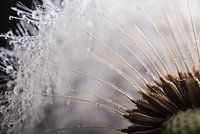 "Witte pluisjes van een de paardenbloem (dandelion)" is een macrofoto van pluisjes van de pluizenbol van een paardenbloem met een donkere achtergrond.