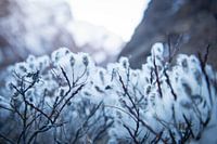 Close-up van witte, pluizige plantjes in Nepal met bergen op de achtergrond. Koel licht zorgt voor blauwe tonen. De bergen op de achtergrond zijn bedekt met sneeuw. Simplistische sfeer foto.