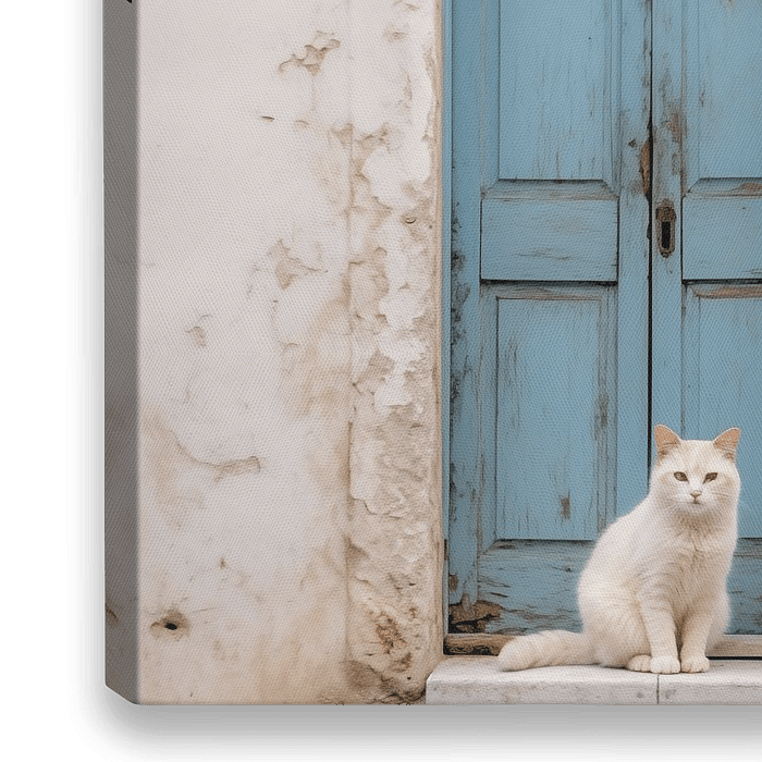 Afbeelding van een witte poes, zittend op de drempel voor een oude blauwe deur van een woning in Griekenland.