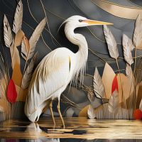 Chique kunstwerk van een elegante witte reiger. Werk in donkerblauw, lichtbruin goud wit en rode tinten. Dit contrastrijke kunstwerk heeft een vierkant formaat.