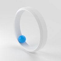 Minimalistisch beeld van een witte ring met een blauwe bal.