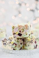 Witte rocky road, met turksfruit, noten, marshmallows, cranberries op een glazen bordje.