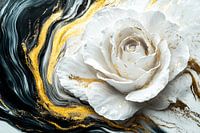 Dit ontwerp straalt luxe en verfijning uit door de combinatie van een delicate witte roos met gouden details en een achtergrond met vloeiende, abstracte lijnen in zwart en grijstinten. De gouden accenten voegen een vleugje glamour toe, terwijl de algehele compositie modern en eigentijds aanvoelt. Perfect voor interieurs waar kunst een statement mag maken, zoals in de woonkamer, eetkamer of een stijlvolle kantoorruimte. Dit ontwerp is een ideale keuze voor iedereen die op zoek is naar een kunstwerk dat tegelijkertijd rust en elegantie uitstraalt.