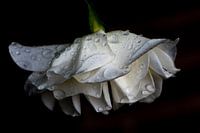 De roos Schneewittchen hangt na te druppelen na een hevige stortbui.