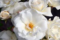 Prachtige bloembedden aangelegd. De zachtheid van de bloemen en rozen zie je terug op deze foto. Het licht weerkaatst mooi op de details van de bladeren.