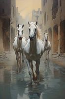 "Witte schimmen" is een expressief werk dat de etherische schoonheid van witte paarden verweeft met het stille, verlaten decor van een stedelijke omgeving. De paarden, schijnend met een bijna bovennatuurlijke helderheid, lijken door de straten te zweven, waarbij hun reflecties in het wateroppervlak de grenzen tussen realiteit en weerspiegeling vervagen. Dit digitale impressionistische werk speelt met de tegenstelling van levendige, levende wezens en de ingetogen, bijna monochrome stad, een mengeling van verval en gratie. In een interieur brengt het een subtiele, rustige energie, waardoor het bij uitstek geschikt is voor ruimtes die een gevoel van kalmte en contemplatie nastreven. Het stuk is zowel een rustpunt als een bron van inspiratie, een getuigenis van de onverwachte schoonheid die ontstaat wanneer wildheid en stedelijkheid elkaar ontmoeten.