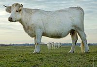 Deze witte koe met kalf in de Kwade Hoek zij gefotografeerd tijdens mijn wandeling op Goeree in Zuid-Holland. De Kwade Hoek is een prachtig natuurgebied dat deel uitmaakt van de duinen van Goeree. De vegetatie is erg afwisselend en er grazen runderen. De witte koeien trappen kale plekken in de grond, en zo onstaan er kiemmogelijkheden voor nieuwe planten. De witte of creme kleurige koe, ook wel Charlois rund is een prachtig dier in dit fraaie landschap. De koeien laten zicht graag portretteren.