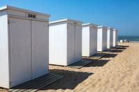 Witte strandhuisjes op het strand van Knokke in Vlaanderen, België in de zomer met een blauwe lucht en de zee in de achtergrond.