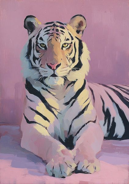 Dit realistische schilderij toont een witte tijger met zwarte strepen, liggend op een lichtroze ondergrond. De voorpoten zijn gekruist, de kop is iets geheven en de tijger kijkt recht vooruit. De gele ogen met zwarte pupillen zorgen voor opvallende accenten. De eenkleurige roze achtergrond zorgt voor een duidelijk contrast en trekt de…