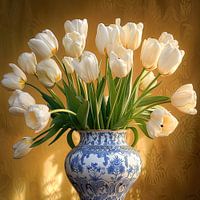 Een Delfts blauwe aardewerken vaas met een grote bos witte tulpen. Het boeket staat voor een goud kleurige achtergrond.
