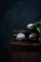 Verse witte tulpen op een houten ondergrond in een donkere stijl.