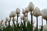 Witte tulpen tegen lichte lucht in de Noordoostpolder, gefotografeerd vanuit kikkerperspectief.