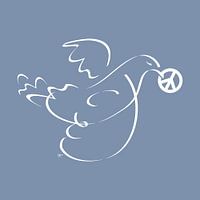 Een duif die het vredesteken vasthoudt. Het is een lijntekening in wit op een warme blauwe tint. Dit werk gaat over vrede en liefde.