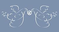 Twee duiven die het vredesteken vasthouden. Het is een lijntekening in wit op een warme blauwe tint. Dit werk gaat over vrede en liefde.