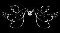 Twee duiven die het vredesteken vasthouden. Het is een lijntekening in wit op zwart. Dit werk gaat over vrede en liefde.